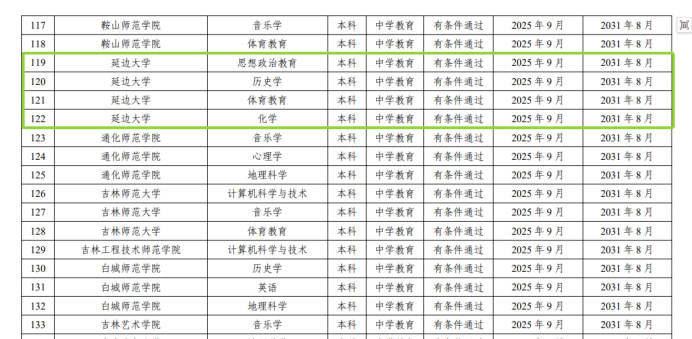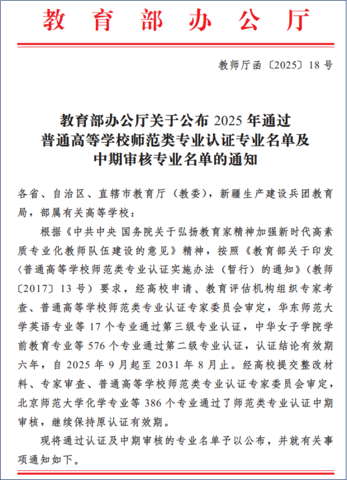 近日,教育部办公厅发布《关于2025年通过普通高等学校师范类专业认证专业名单及中期审核专业名单的通知》(教师厅函〔2025〕18号),我校化学、历史学、思想政治教育、体育教育等4个专业通过师范类专业第二级认证,认证有效期为六年(2025年9月至2031年8月)