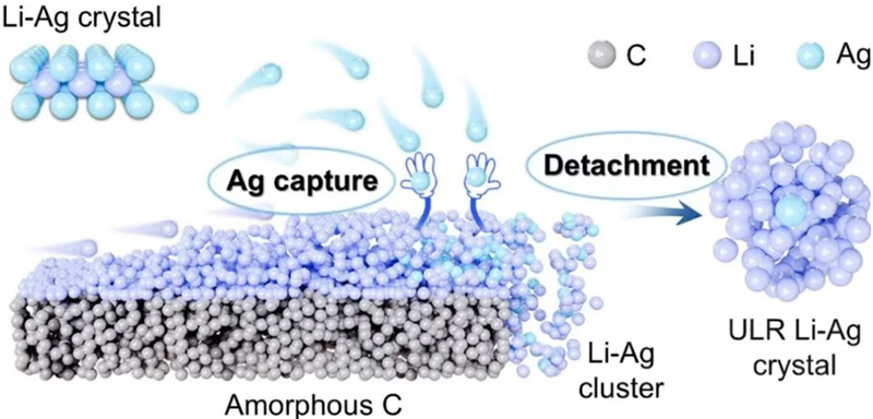 超富锂(ULR)合金因其储锂容量高、电压平台与锂金属相当,且可通过固溶锂化机制抑制锂枝晶生长,成为高安全、高能量密度锂金属电池负极的研究热点。然而,该类负极的应用长期受困于两大关键挑战:形成机理不明确与完全脱锂后可逆性需依赖银-碳纳米复合层(Ag-C NCL)辅助。