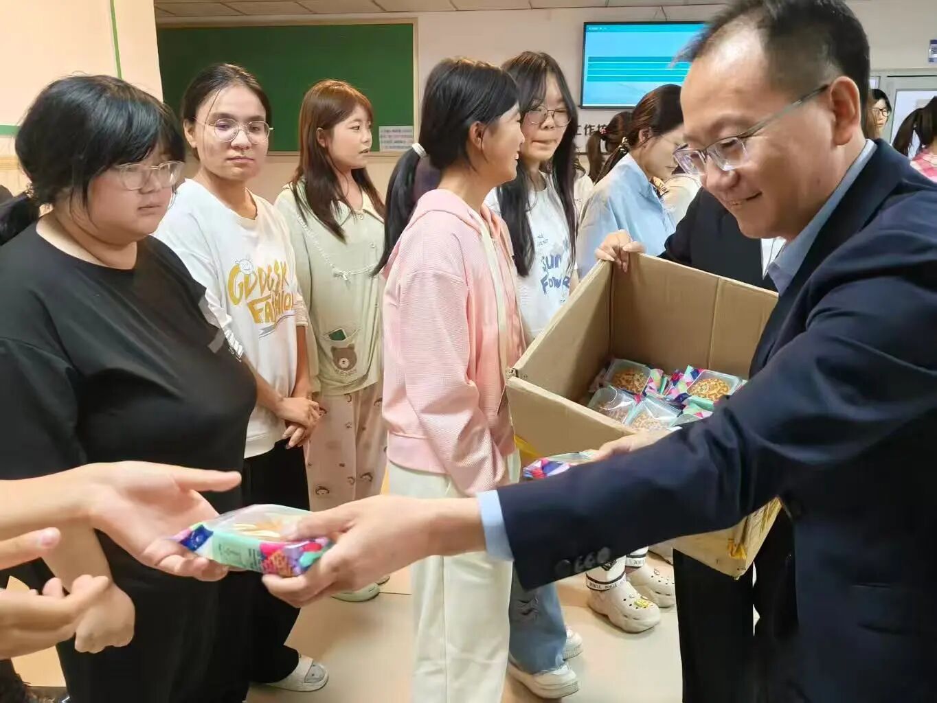 “真的好惊喜,没想到书记会专门来看望我们!”“真的特别感动,感觉就像在家一样温暖!”同学们收到月饼和节日祝福,脸上洋溢着幸福的笑容,语气中满是感动,纷纷向朴书记表达诚挚的感谢。
