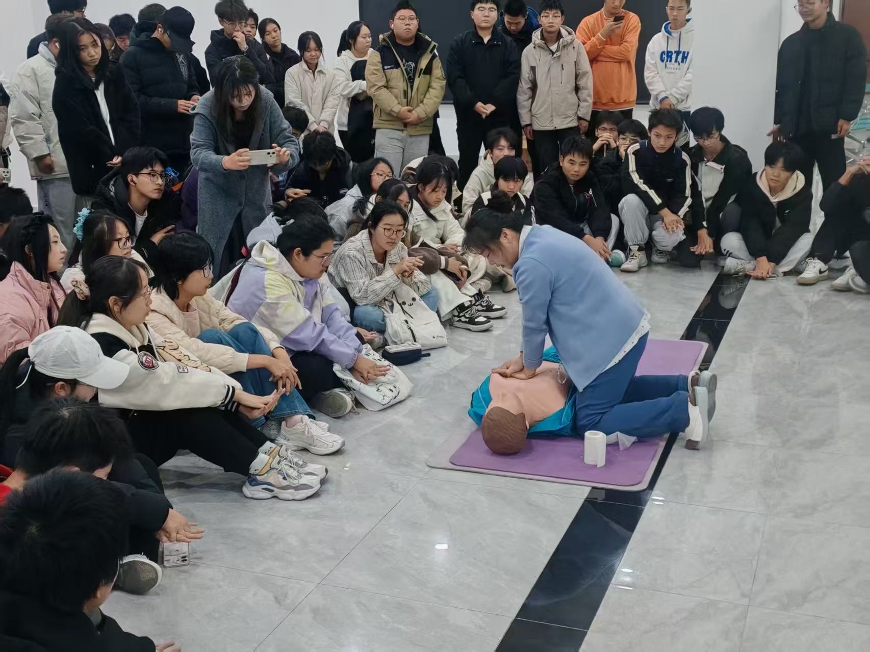培训现场,全体新生认真专注,专业人员通过人体模型演示了心肺复苏的完整流程:从现场环境评估、意识和呼吸判断,到胸外按压的正确定位、按压深度与频率,再到开放气道和实施人工呼吸的规范动作。每一个细节都关乎生命存续,深深吸引了在场的每一位同学。