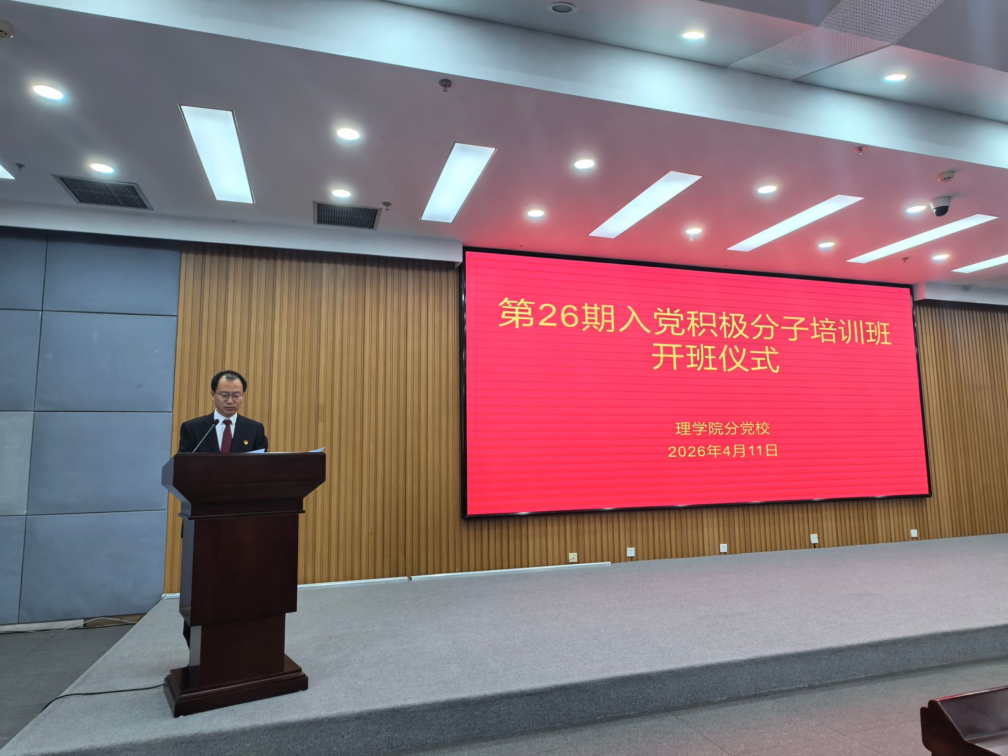 开班仪式由理学院党办主任苗宇主持,理学院党委书记朴虎森为本次积极分子培训致辞,并提出了希望和要求:一、以理想信念铸魂,做政治上的明白人;二、以实干担当立身,做行动上的实干家;三、以纪律规矩正身,做作风上的干净人,在新时代新征程上践行初心、勇担使命。陈颢元代表全体参训学员郑重承诺:一定会珍惜学习机遇,端正入党动机,坚持学以致用、知行合一,自觉接受组织考验,在自我完善中砥砺成长。最后,理学院党办主任苗宇向积极分子们介绍了发展党员的工作流程。