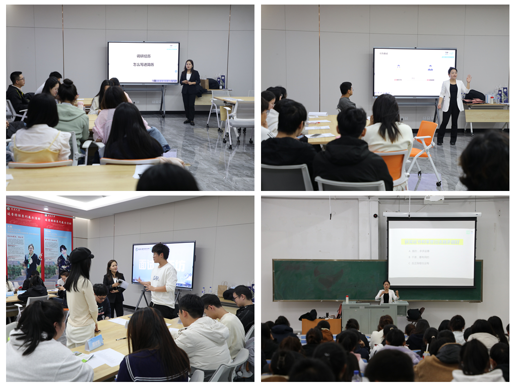 在简历指导环节,刘学英老师从简历的整体框架搭建、个人信息呈现的详略得当、教育背景与实习经历的重点突出、技能证书的精准匹配等方面进行了系统讲解。现场学生们纷纷拿出自己准备的简历初稿,就项目经历的表述方式、获奖荣誉的排序逻辑等具体问题与老师展开热烈互动,刘老师逐一进行细致点评和针对性修改建议,使学生们对如何打造一份“亮眼”简历有了更清晰的认识。
